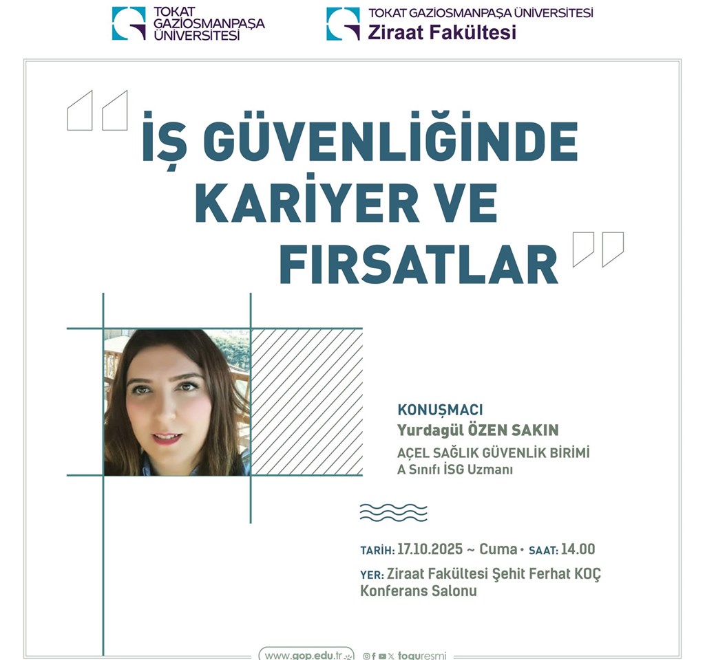 Açel Sağlık Güvenlik Birimi A Sınıfı İSG Uzmanı Yurdagül ÖZEN SAKIN tarafından 17.10.2025 tarihinde saat:14:00'de Şehit Ferhat Koç Konferans Salonunda fakültemiz öğrencilerine yönelik “İŞ GÜVENLİĞİNDE KARİYER VE FIRSATLAR” konulu söyleşi gerçekleştirecektir.