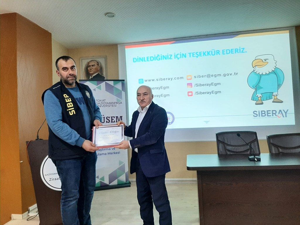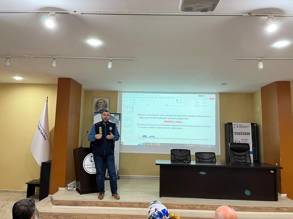 Fakültemizde, Üniversitemiz Sürekli Eğitim Araştırma ve Uygulama Merkezi (TOGÜSEM) ile Tokat İl Emniyet Müdürlüğü iş birliğinde öğrencilerimizin dijital dünyadaki risklere karşı bilinçlendirilmesi amacıyla "SİBERAY Farkındalık Eğitimleri" gerçekleştirilmiştir. Bu kapsamda, gençlerin dijital ortamlardaki güvenliğini sağlamaya yönelik hazırlanan "Sanal Tehditleri Fark Et, Kendini Koru" konulu eğitim programı Polis memuru Ahmet Aziz tarafından, 13 Mart 2026 Cuma günü saat14:00'de Fakülteniz konferans salonunda yapılmıştır. Değerli bilgilendirmeleri için Polis Memuru Ahmet Aziz’e teşekkür belgeleri Ziraat Fakültesi Dekanı Prof. Dr. Resul GERÇEKCİOĞLU tarafından takdim edilmiştir. Eğitim sonuda katılım sağlayan tüm öğrencilere e-devlet üzerinden alabilecekleri “Katılım sertifikası” düzenlenmiştir.