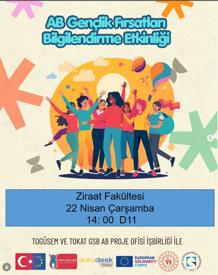 Fakültemizde, TOGÜSEM ve GSB Tokat AB Proje Ofisi İşbirliği ile “AB Gençlik Fırsatları Bilgilendirme Etkinliği” toplantısı 22 Nisan Çarşamba Günü saat 14: 00’de D11’ de yapılacaktır.